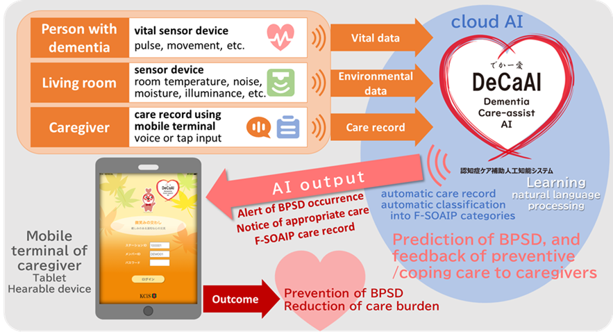日本国内でも、認知症ケアの未来を切り拓く取り組みが進んでおり、認知症介護研究・研修東京センターや認知症高齢者研究所、産業技術総合研究所らが連携して開発しているのが、DeCaAI(Dementia Care-assist AI system)である。このAIは、バイタル情報・環境センサー・介護記録などをリアルタイムで解析し、BPSD(行動・心理症状)を30~60分前に予測。適切なケア方法を介護職に通知することで、症状の未然防止や重度化の回避を目指している。