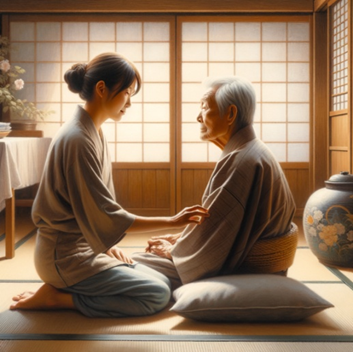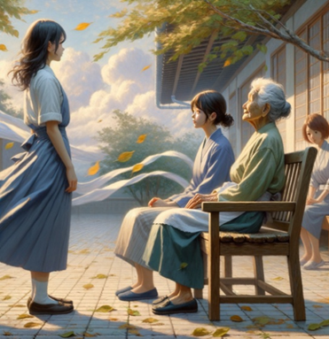 そっと襖を開けると、部屋の奥、窓辺に背を向けて座る女性の姿が見えた。 白い髪に、淡いピンクのカーディガン。 その背中は、まるで春の風にそっと揺れる梅の枝のように、静かで、どこか寂しげだった。