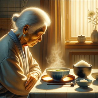 朝の光が差し込む食堂で、ミサちゃんは静かに座っていた。 テーブルの上には、湯気の立つお味噌汁と、まだ手をつけていないごはん。